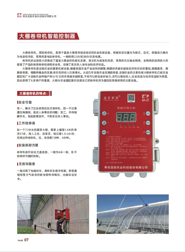 壽光龍?zhí)镛r(nóng)業(yè)科技股份有限公司于2014年創(chuàng)立于“蔬菜之鄉(xiāng)”----山東壽光。公司立志用科技服務(wù)三農(nóng),以幫助農(nóng)業(yè)企業(yè)和個(gè)人提高農(nóng)業(yè)生產(chǎn)率,協(xié)助農(nóng)業(yè)企業(yè)和個(gè)人生產(chǎn)健康安全的高品質(zhì)農(nóng)產(chǎn)品為使命。踐行“自強(qiáng)不息,厚德載物”的企業(yè)理念,專(zhuān)注于設(shè)施農(nóng)業(yè)裝備研發(fā),研發(fā)生產(chǎn)了“溫室智腦”智慧農(nóng)業(yè)物聯(lián)網(wǎng)系統(tǒng)、大棚智能放風(fēng)機(jī),“龍?zhí)ь^”大棚運(yùn)輸車(chē),“春暖花開(kāi)”紅外反射大棚保溫被,大棚卷簾機(jī)等系列產(chǎn)品。公司于2017年在齊魯股權(quán)交易中心掛牌上市,股票代碼302505。 公司擁有注冊(cè)商標(biāo)12個(gè),實(shí)用新型專(zhuān)利18項(xiàng),外觀(guān)專(zhuān)利4項(xiàng),并獲得了ISO9001質(zhì)量管理體系認(rèn)證證書(shū),2021-2023年科技型中小企業(yè)稱(chēng)號(hào)。溫室智腦大棚放風(fēng)機(jī),獲得2020年度農(nóng)業(yè)農(nóng)村部舉辦的創(chuàng)新比賽優(yōu)秀獎(jiǎng)。 2022年,中央網(wǎng)信辦、農(nóng)業(yè)農(nóng)村部、國(guó)家發(fā)展改革委、工業(yè)和信息化部、國(guó)家鄉(xiāng)村振興局聯(lián)合印發(fā)的《2022年數(shù)字鄉(xiāng)村發(fā)展工作要點(diǎn)》又進(jìn)一步細(xì)化了智慧農(nóng)業(yè)在2022年的重點(diǎn)任務(wù),龍?zhí)镛r(nóng)科將抓住歷史機(jī)遇,打造智能化的系列裝備,讓農(nóng)業(yè)生產(chǎn)更高效,更智能。